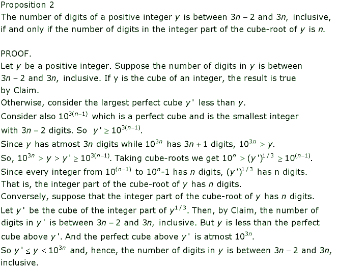 According to Proposition 2, an integer having number of digits in the range from 3n-2 to 3n, inclusive, has n digits in the integer part of its cube-root. Thus, for instance, for n=1, each of the numbers 1 to 999 has a single digit in the integer part of its cube-root. So why does the cube-root algorithm work?