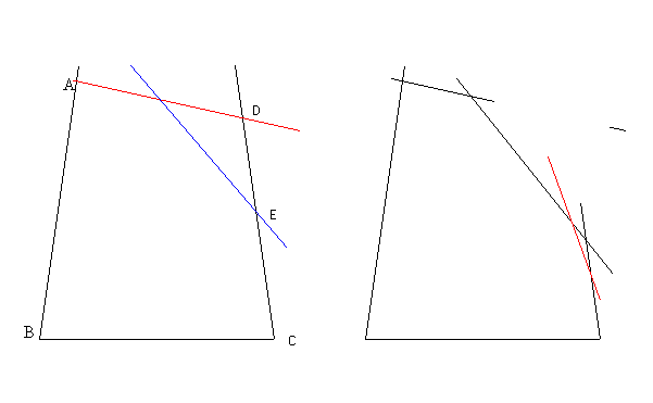 We have proved that the number of acute angles in a convex n-gon is at most three. To complete the proof that the maximum number of acute angles is three, we need to prove that, for any n, there is a convex n-gon with three acute angles. We can do this by giving a geometric construction that works for all n. On each of the two ends of a straight line segment BC, erect rays on one side of the segment such that BC makes the same 82.5° angle with each of the rays. Why? Because we need an angle, that is greater than 60 and less than 90, that is constructible with compass and straight edge.