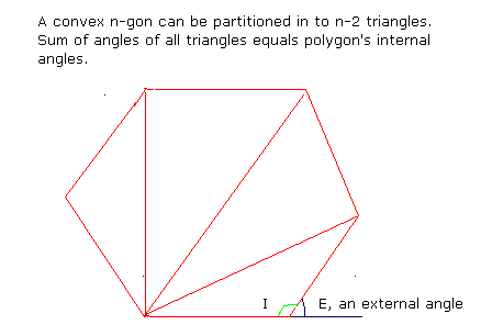 These assertions are part of mathematics folklore. The proof of the second assertion rests on the observation that a convex n-gon can be partitioned into n-2 triangles and that the sum of the angles from all these triangles equals the sum of the internal angles of the polygon. The first assertion follows from the second assertion and the fact that the exterior angle at a vertex is supplementary to the internal angle of the polygon at the vertex.