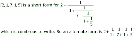 Notice that the numerators of the fractions in the alternate representation are 1's. Continued fractions where the numerators are positive integers - 1's in the above example - are called simple continued fractions. So rational fractions are finite simple continued fractions.