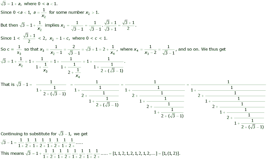 We will show later that √3 = [1,1,2,1,2,1,2,...] = [1,(1,2)]. The repeating string can be long in some instances: √31 = [5,(1,1,3,5,3,1,1,10)]. You will notice that if you do not consider the last number in the string, the remaining part of the string is symmetric about the centre of the string and that the last number in the string is double the number in the center of the symmetric part. This has been proved to be the case for all quadratic irrationals. Let us return to the strings that repeat in the continued fraction expansion. When this happens, we call the continued fraction "periodic." Joseph Louis Lagrange discovered in 1770 A.D. that the continued fraction expansion of any quadratic irrational is periodic after a while. The method we used to find the continued fraction representation of √2 will work [3] also for all integers of the form m2 + 1. There are general methods [2] for obtaining the continued fraction expansion of √Q, for any non-square integer Q.