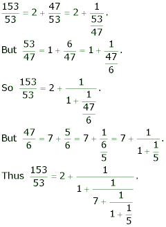 A number is usually written down using the place-value system. There are other systems. One such system is Continued Fractions. Let us look at how rational fractions and irrational numbers can be represented as continued fractions. For instance, the continued fraction representation of 153/53 is given on the bottom step in the left column below. Since it is cumbersome to obtain the needed numbers in the manner shown in the left column, we show a faster way [3] on the right column.