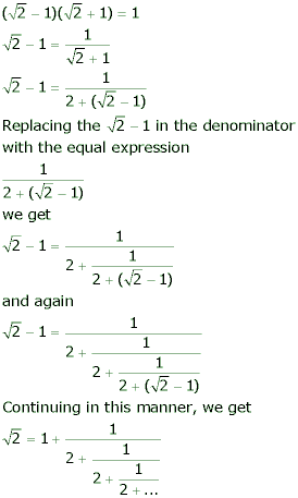 We say the continued fraction expansion of √2 is [1,2,2,2,...]. It is an example of an infinite continued fraction which every irrational number is. √2 is an example of a quadratic irrational because it is the solution of the quadratic equation x2 - 2 = 0. In fact, any number of the form