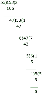 The continued fraction representation of 153/53 is written as [2,1,7,1,5]. This is a finite continued fraction. It is a consequence of the Euclidean Algorithm that the continued fraction representation of all rational fractions must terminate. The funny division process in the right column allows us to see this: In a division, the remainder is smaller than the divisor. But in the right column, the remainder in each division becomes the divisor in the next division. So the remainders become smaller and smaller, ultimately reaching zero where the funny division ends. This proves that every rational fraction can be represented as a finite continued fraction.